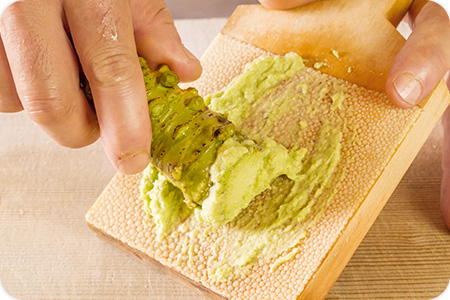 わさびは下ろすならサメ皮の卸し板に限るといわれますが、一般家庭ではこだわることはないと思います。なるべくキメの細かい板を使えば何製でもいいでしょう。ただ、わさびは金気を嫌うので、おろしたらすばやく陶磁器の器に移すようにします。